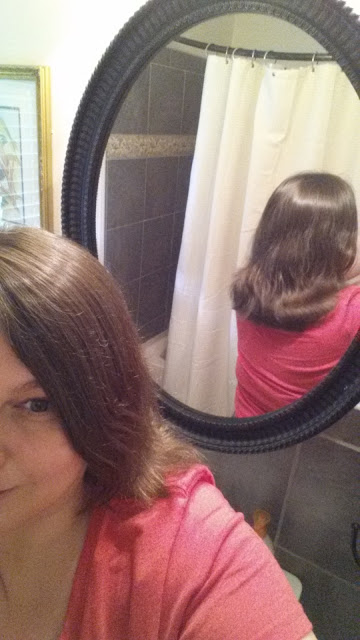 In January and February I started losing an alarming amount of hair. Every time I took a shower there would be gobs of hair around the mesh drain covering. Of course I googled it (thanks Doctor Google!) and discovered that stress can make that happen. Apparently you're supposed to think back two or three months before the hair loss started to see what was going on in your life. Well, we bought a house and moved in November. So there you go. I'm beyond thankful that the loss seems to have gone back to a normal amount, even though now I have tons of 1-2 inch new hairs that stick out all over. Hey, at least it's growing back, right?! I hadn't had a haircut in several months and my hair was looking bad. Limp and tired, thin, with dead ends. I usually go to our local Great Clips to get my hair cut, but that's always a crapshoot. I've had some of the best and some of the worst cuts of my life there. I went yesterday hoping to get someone good, and as luck would have it a woman named Wendy who has hair very similar to mine in texture and color was assigned to me. She listened sympathetically to my tale of hair woe, assured me that she's seen lots of people lose a bunch of hair when they're stress and that it always grows back, and then talked to me about the best method of cutting fine hair like mine. I was very, very pleased with the results. The cut is good (hard to see that in these two pictures) and now my hair looks much healthier and shinier again. Wendy was a godsend! I feel so much better about how I look right now.